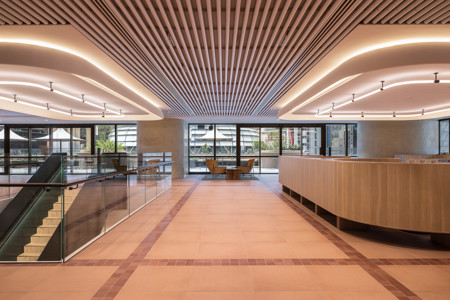 Designed by Architectus, the sculptural ceiling was realised through a custom configuration of our SAS600 Raft System. Each panel is perforated to provide excellent acoustic performance, while the curved profile amplifies sound absorption and visual depth.