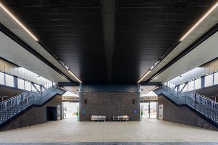 Specified across all eight stations was our SAS200 concealed grid hook-on metal ceiling system. Finished in jet black with bespoke circular perforations, the system not only emphasises each station’s unique visual identity but also provides the acoustic performance required for demanding transport environments.